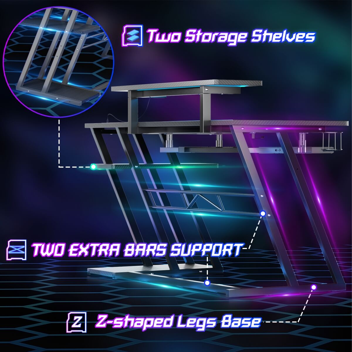 Sleek & Sturdy Build: Carbon fiber finish with Z-shaped legs and cross-beam support for durability. Stylish and stable for heavy use.