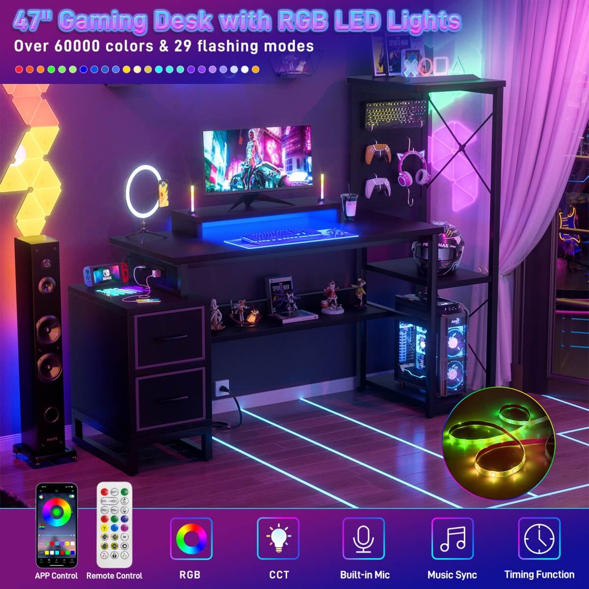 Smart RGB LED Gaming Desk: 60,000+ colors & 29 flashing modes with CCT, mic sync, and timer. Control via app/remote for the perfect ambiance.