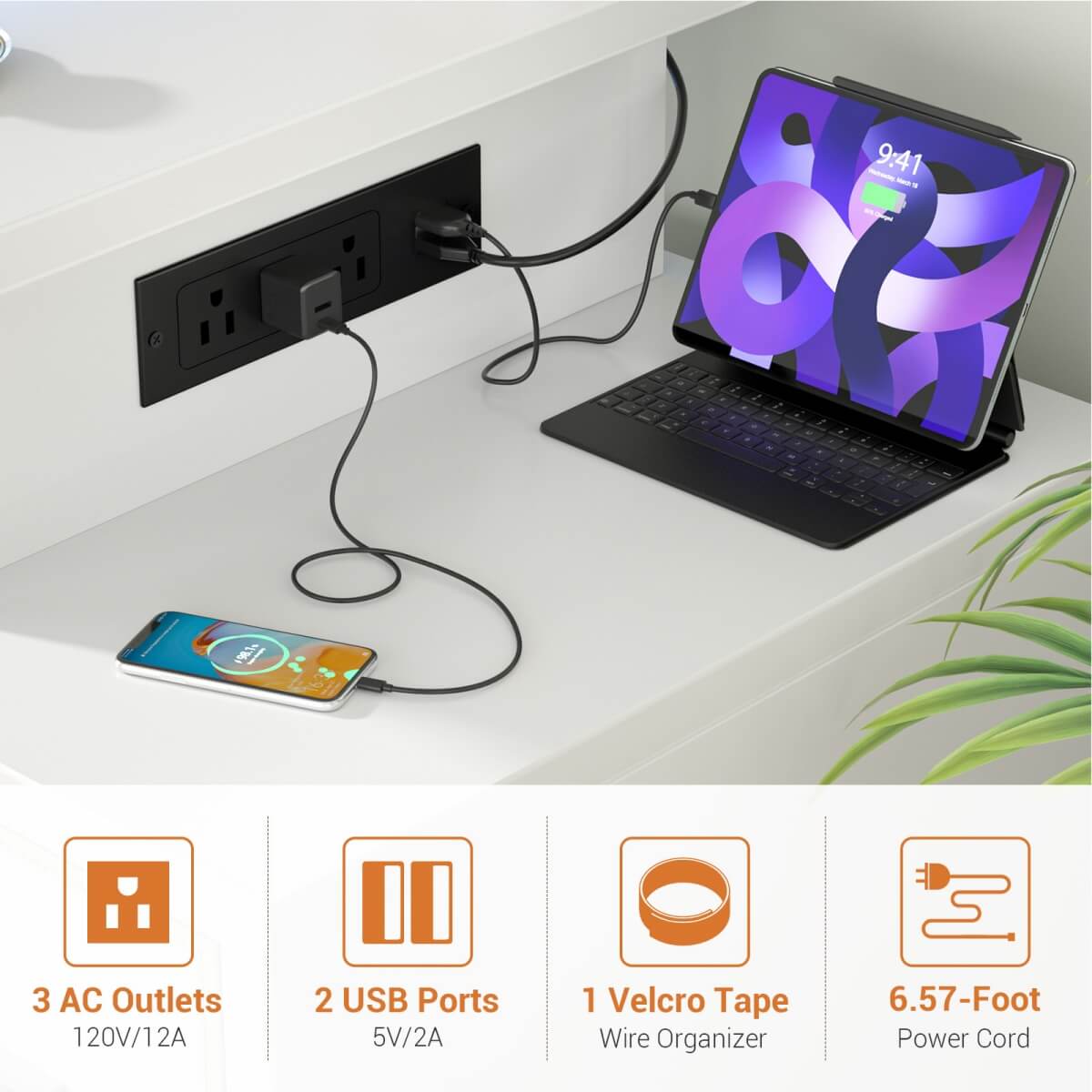 Built-in Power Outlets & USB Ports: Includes 3 AC outlets and 2 USB ports to charge 5 devices simultaneously. 6.5ft cord + velcro tape for neat cable management.