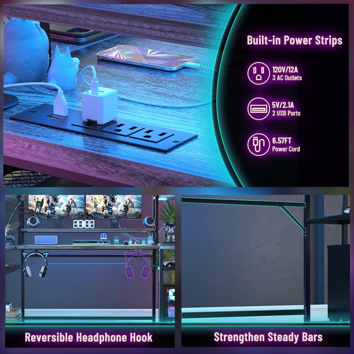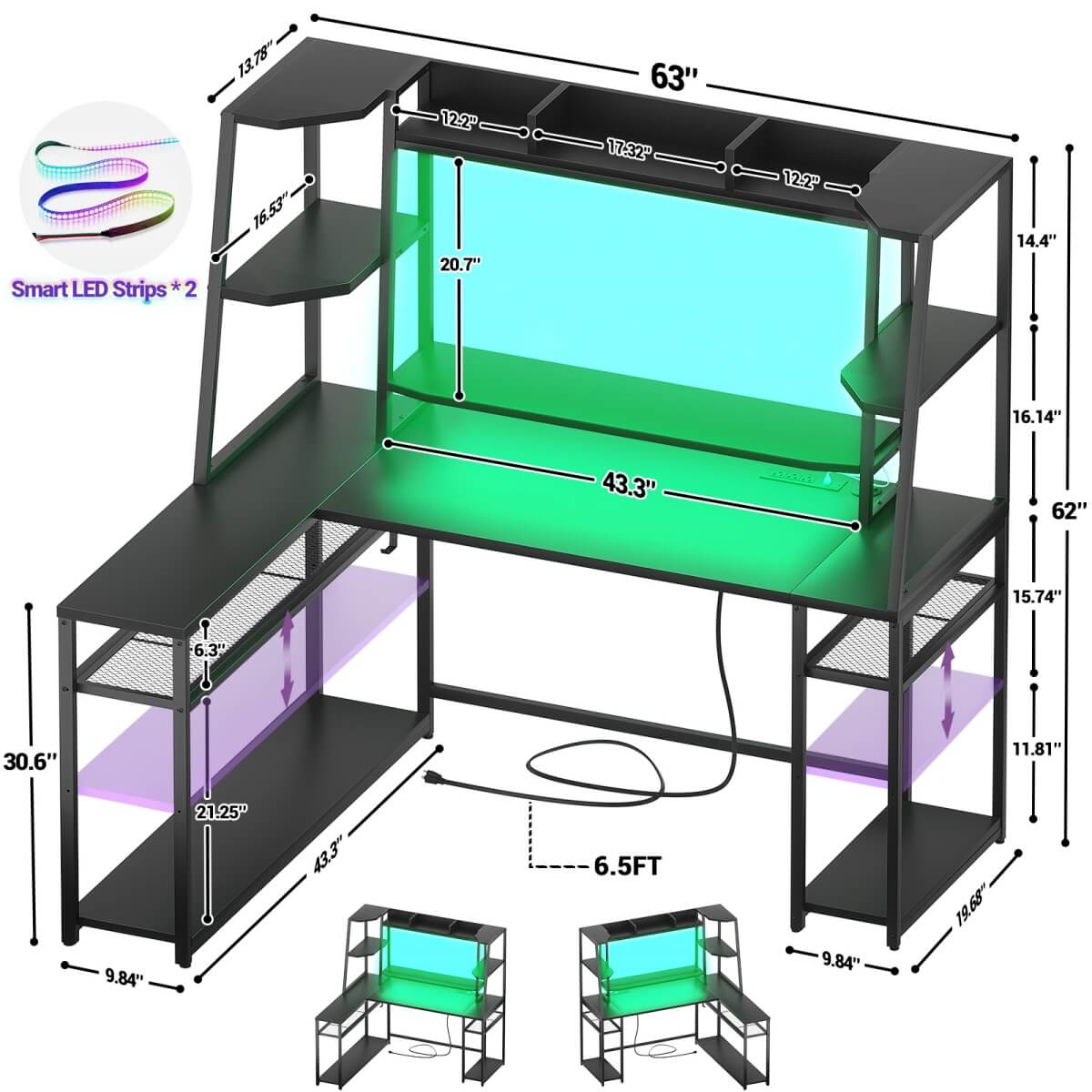 63'' Large L Shaped Gaming Desk with LED Lights & Power Strips, Reversible